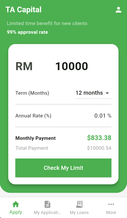 With TA Capital, you can get your loan in just a few working days. Easy Capital offer loan amount up to RM 100, 000 with minimum 3 months repayment terms, and up to 108 months (9 Years). The standard interest is 1.5% per month or 18% per year.